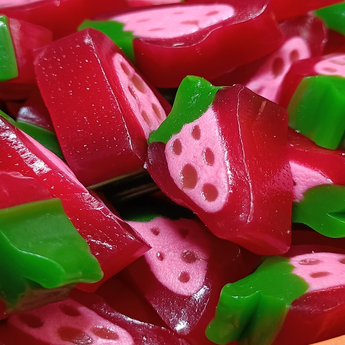 I really like this sweet, it’s chewy fruity with a sugar paste filling and just really nice. A strawberry liquorice that’s refreshing and light.