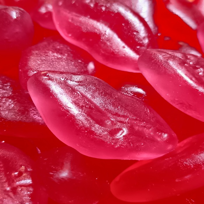 A juicy lip shaped sweet which has a mild taste of cherry.