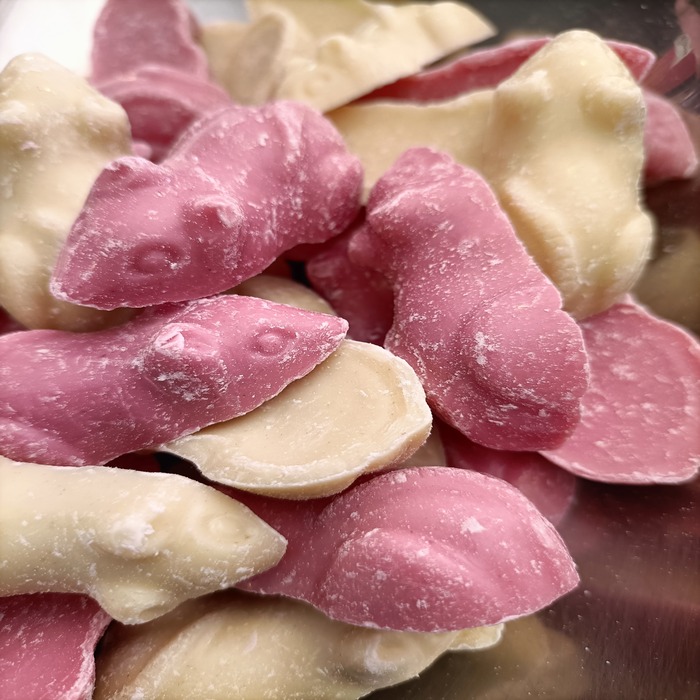 These adorable fun mouse shaped strawberry and cream flavoured candy pieces are a blast from the past. Also available in the smaller size called candy mice. Pink and white mice made by Hannah’s of Johnstone famous for Jazzles and Rainbow drops and many more.
